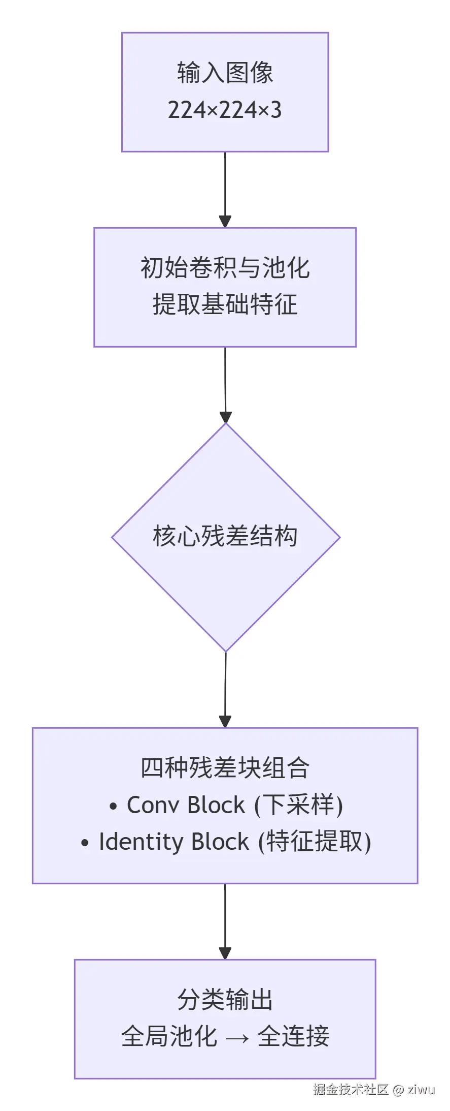 - 块级堆叠:整个网络由4种不同结构的残差块(Conv Block和Identity Block)按特定比例(3,4,6,3)组合而成,分别负责下采样和深度特征提取。