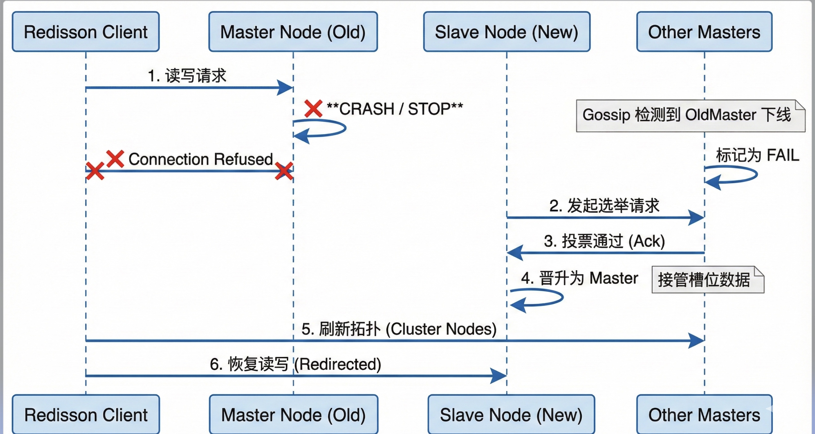 最神奇的是 Redisson 客户端的表现。在短暂的连接报错(毫秒级)后,它迅速收到了集群拓扑变更的通知,自动将后续请求重定向到了新的 Master。整个过程对上层业务几乎无感。