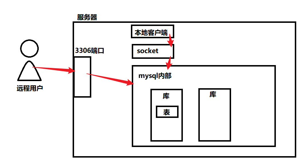 **本地访问(和 MySQL 服务器在同一台 Linux 机器)**走图例里的 socket(本地通信文件),不需要网络端口。直接用 MySQL 客户端命令即可:mysql -u用户名 -p(比如 mysql -uroot -p),默认会通过本地 socket 文件连接到 MySQL 服务器。