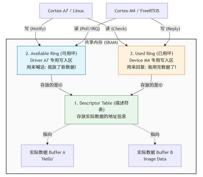 VirtIO 的设计使得 A7 只修改 Available Ring 的索引,M4 只修改 Used Ring 的索引。读写分离,从算法上消除了核间竞态。