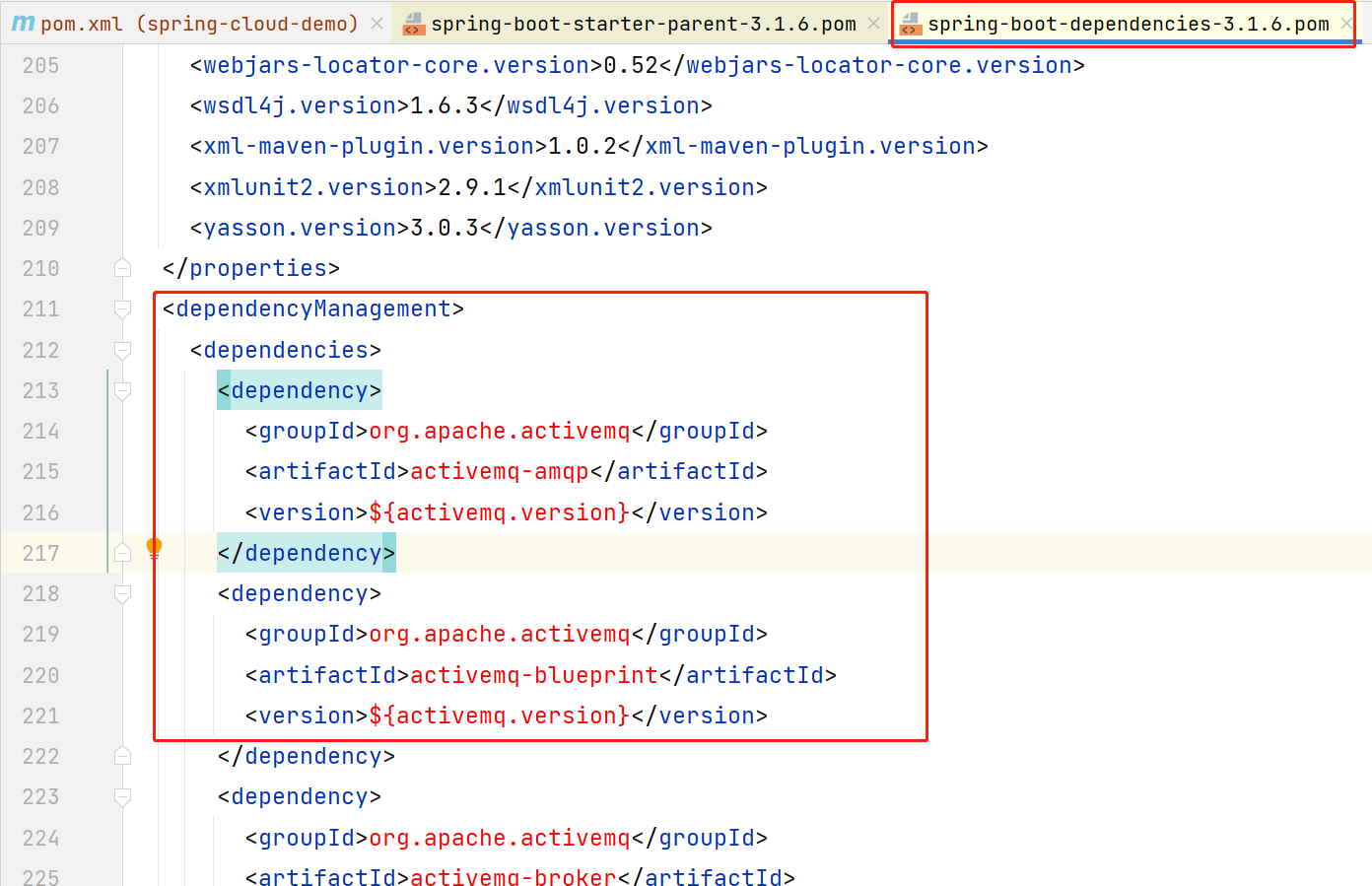 2.dependencyManagement :只是声明依赖, 并不实现Jar包引⼊. 如果⼦项⽬需要⽤到相关依赖, 需要显式声明. 如果⼦项⽬没有指定具体版本, 会从⽗项⽬中读取version. 如果⼦项⽬中指定了版本号,就会使⽤⼦项⽬中指定的jar版本. 此外⽗⼯程的打包⽅式应该是pom,不是jar, 这⾥需要⼿动 使⽤ packaging 来声明.