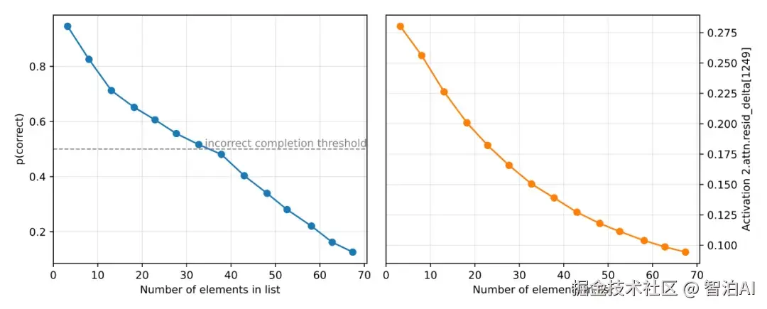 图7. dense 模型在长序列上出现与稀疏电路预测一致的 context dilution 错误模式。
