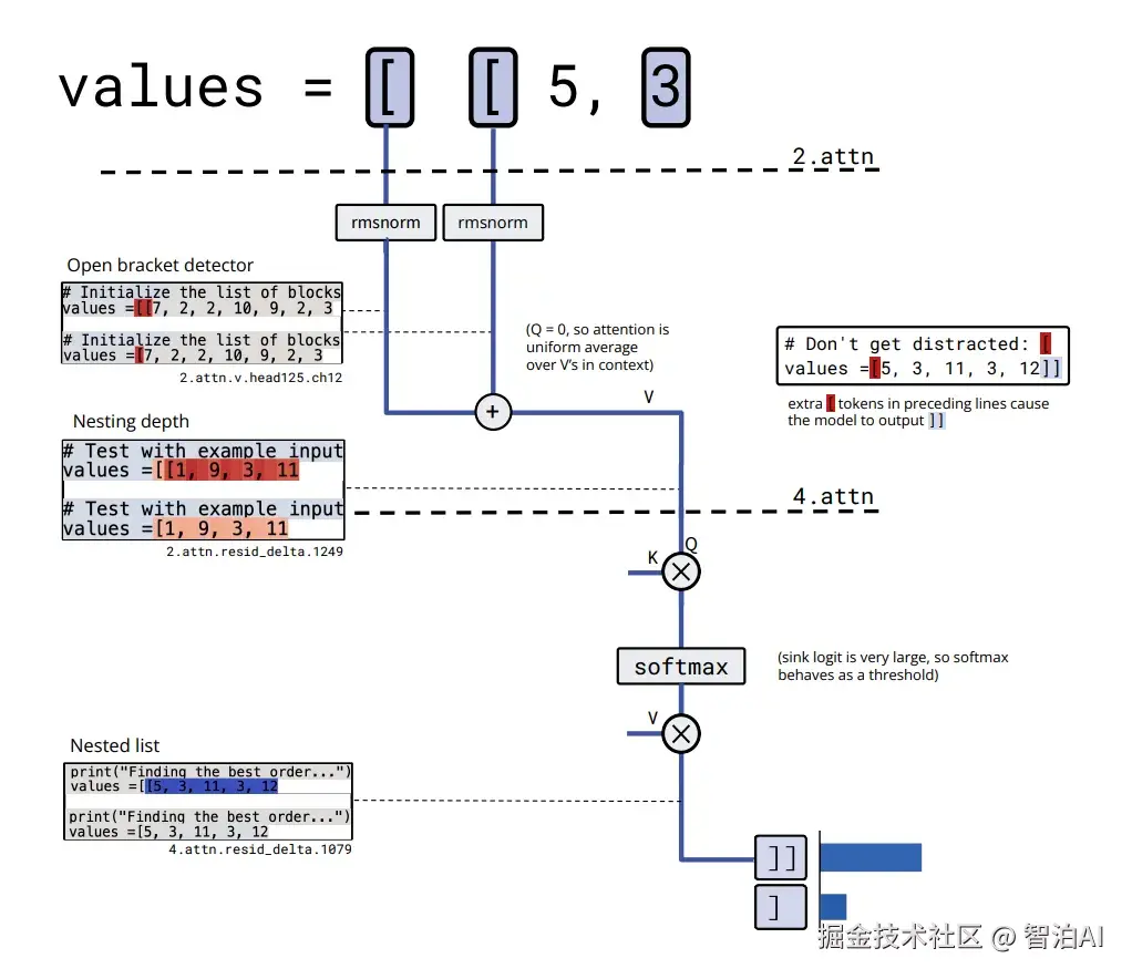 嵌套括号的处理复杂度显著高于引号,然而稀疏模型生成的电路结构始终保持有序。当检测到字符"[ "时,模型会初始化一个"开括号特征",随后通过单一注意力头对该特征的历史值进行全局平均聚合。聚合结果的差异对应不同的嵌套层级,最终输出位置将依据层级判断生成"]"或"]]"。