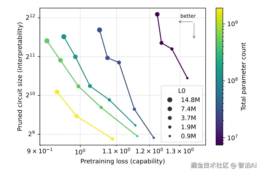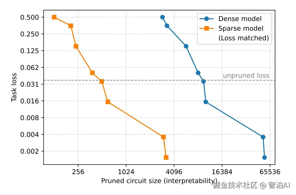 图5. 稀疏模型在所有任务上的最小电路规模显著更小,在相同损失下约比 dense 模型小 16 倍。