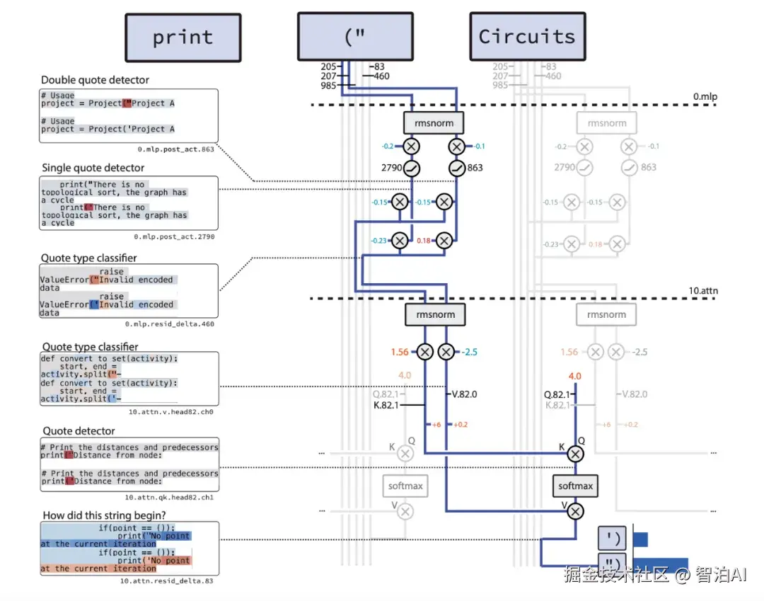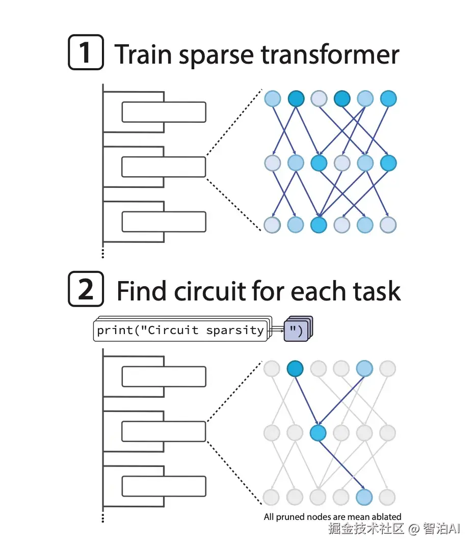 通过维持训练全程的接近零权重状态,模型被迫在最小连接集内完成计算任务。当冗余路径被极致压缩后,那条支撑推理的核心因果链------即论文中定义的"计算电路"(circuit)------便以清晰可追溯的形态浮现。