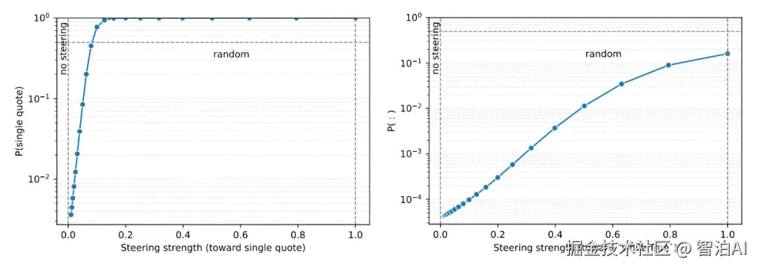 在单双引号('与")的区分任务中,研究人员通过修改稀疏模型中表征引号差异的通道激活状态,并将其参数重新注入dense模型,观察到dense模型的输出概率呈现连续且稳定的变化趋势。