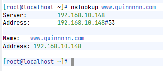 www IN A 192.168.10.148 #访问www.quinnnnn.com IP为192.168.10.148