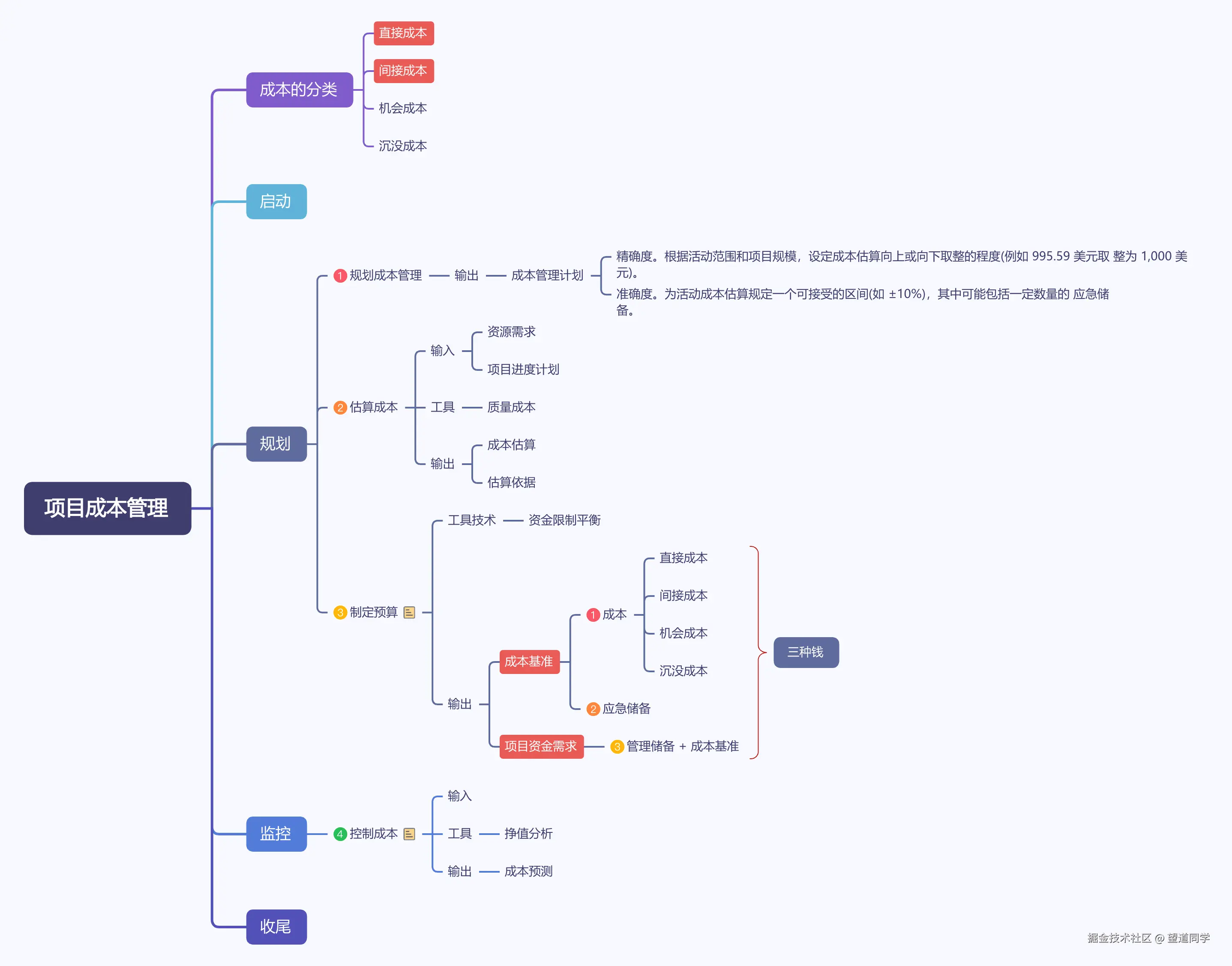 围绕估算成本、制定预算、控制成本三大过程,重点讲解挣值管理(EVM)指标(PV、EV、AC、CV、SV、CPI、SPI)及其应用,是计算题必考模块。