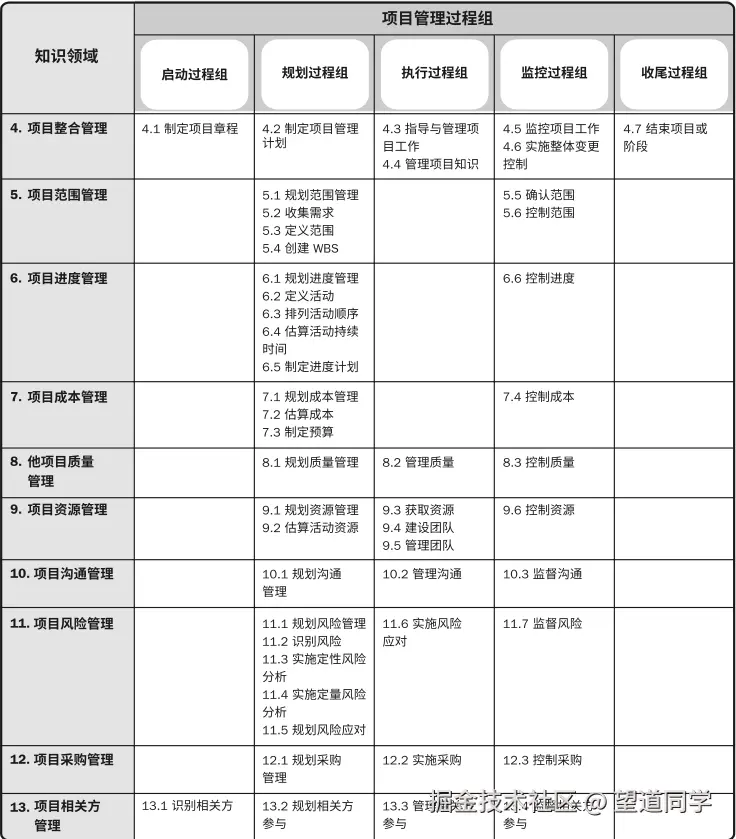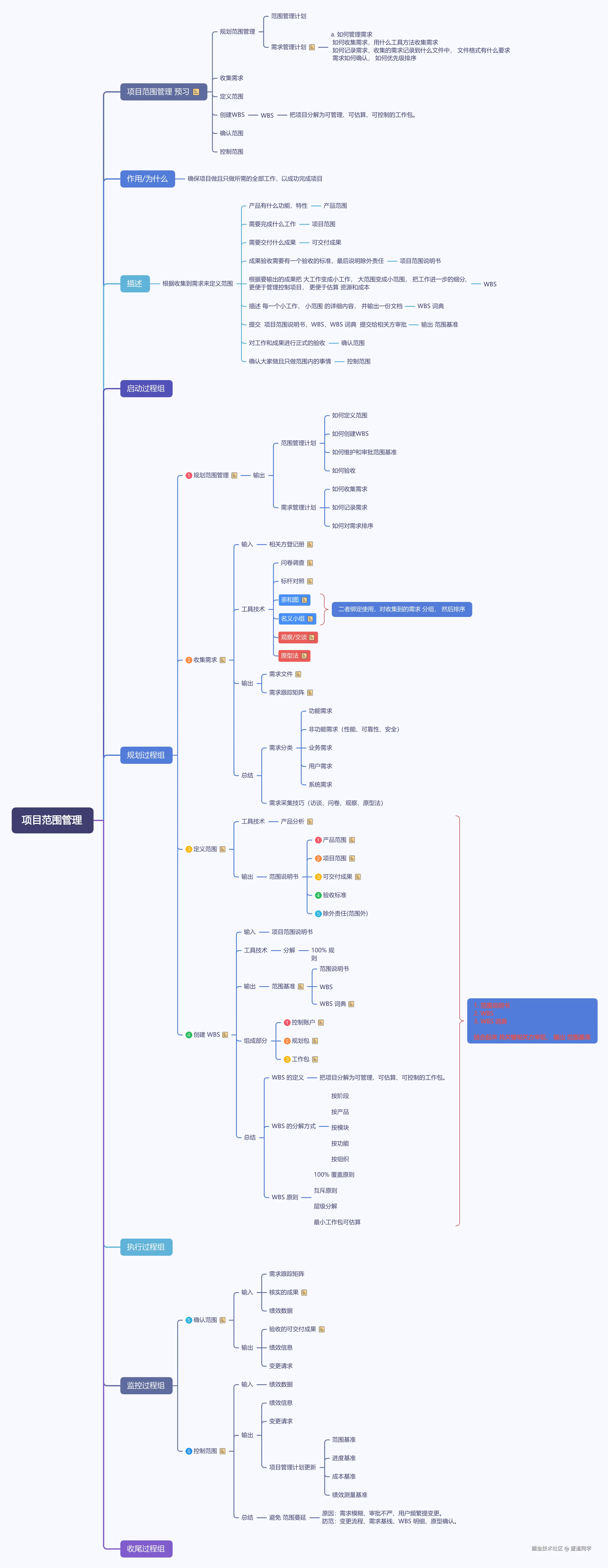 聚焦如何定义和控制"做哪些事、不做哪些事",包括需求收集、WBS分解、范围确认与控制,是防止"范围蔓延"的关键防线。