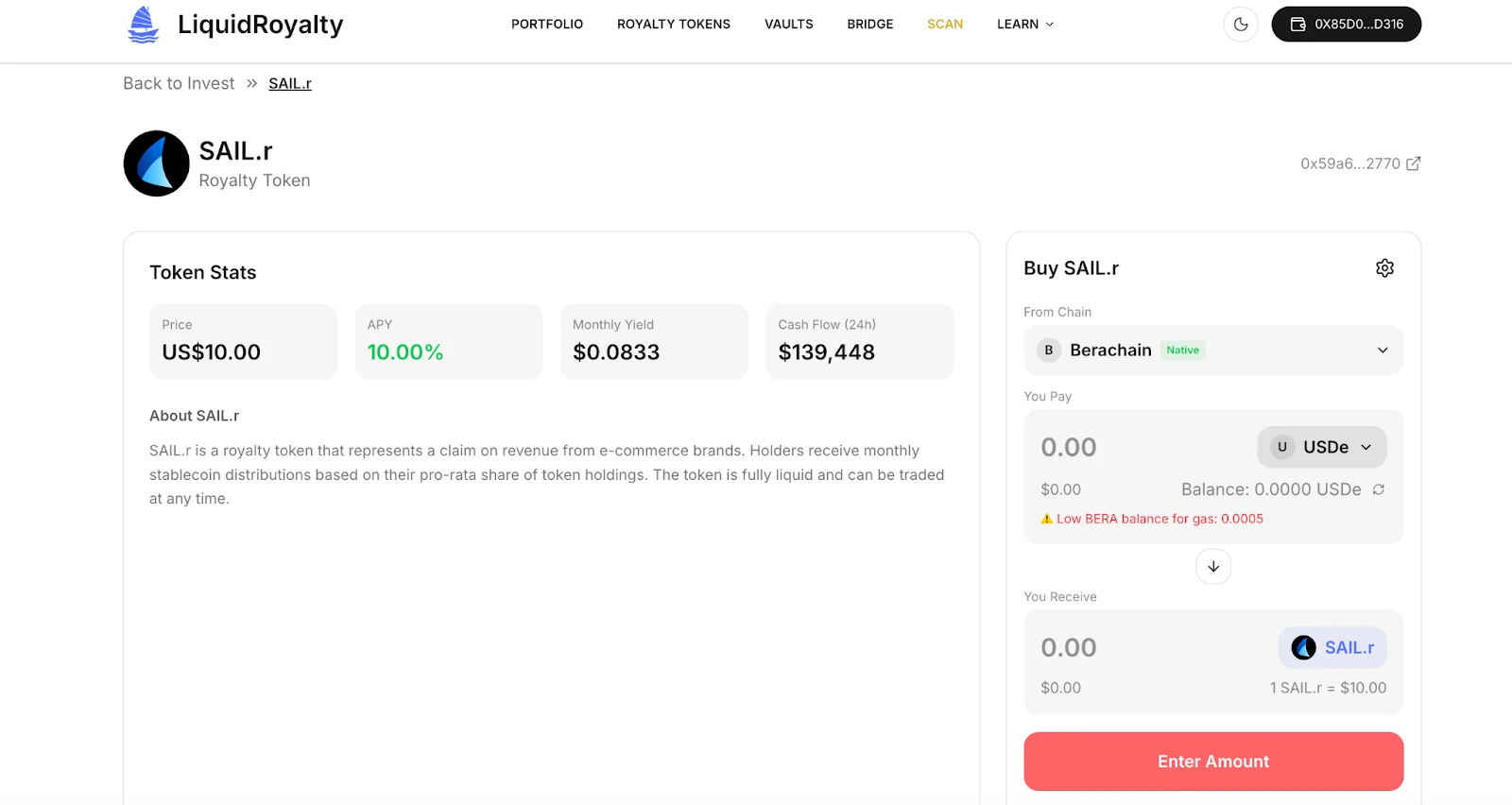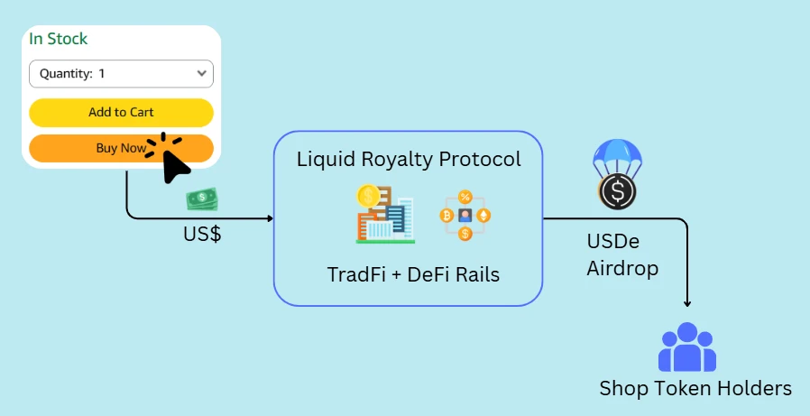 Liquid Royalty 允许用户以最低 100 美元的稳定币(USDe、HONEY)购买 Royalty Token,并直接按比例享受每月来自真实消费订单的稳定币分红。它的体验更像"持有一家高速增长电商的链上股份",却没有股权稀释、没有复杂合规门槛,也没有漫长的申购流程。