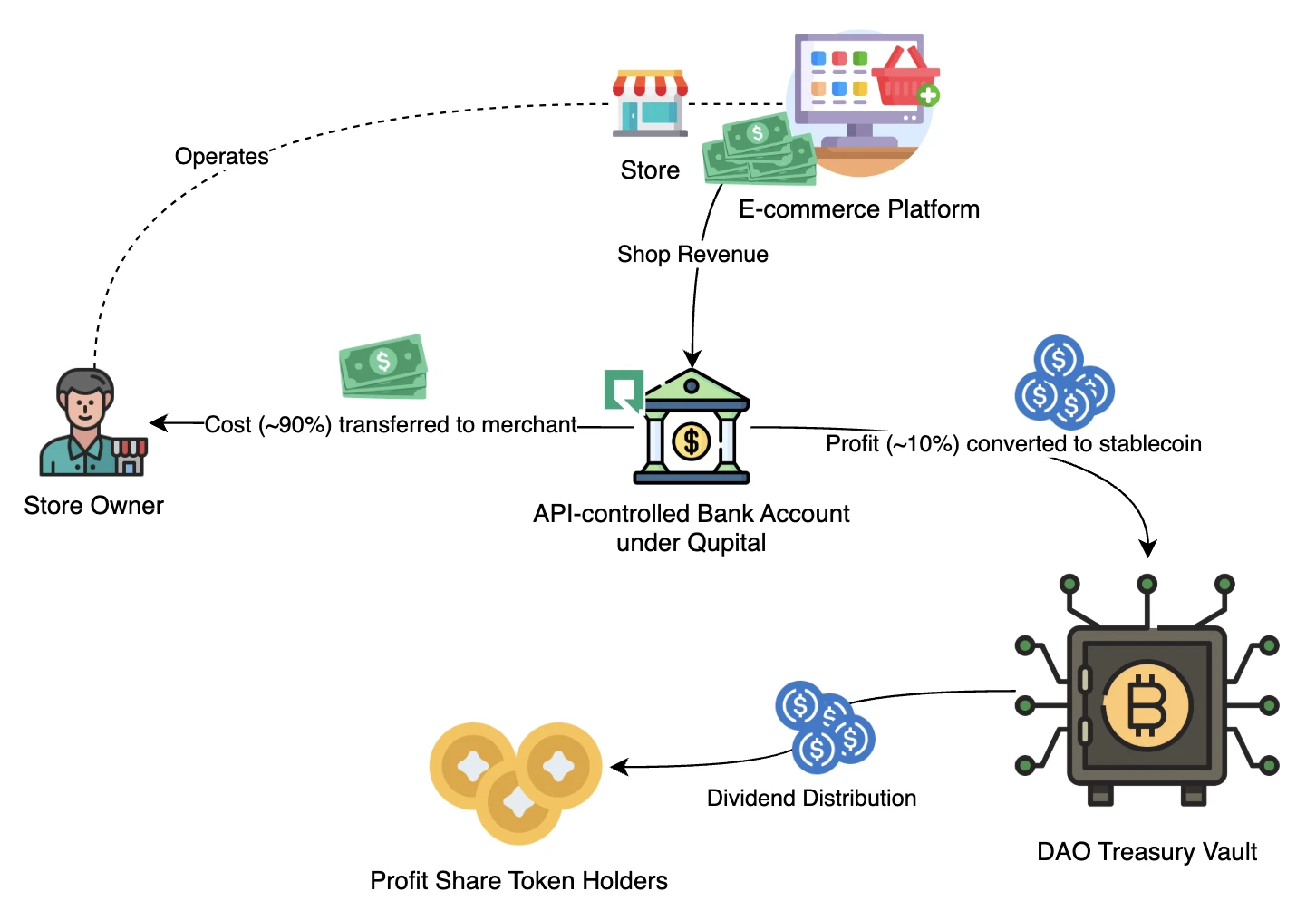 在链下,商户 10% 的销售额在支付网关层面就被自动重定向到协议账户,商户根本无法触碰分红资金;同时所有商户签署美国或香港法律合同,违约将触发法律结构甚至店铺控制权接管。