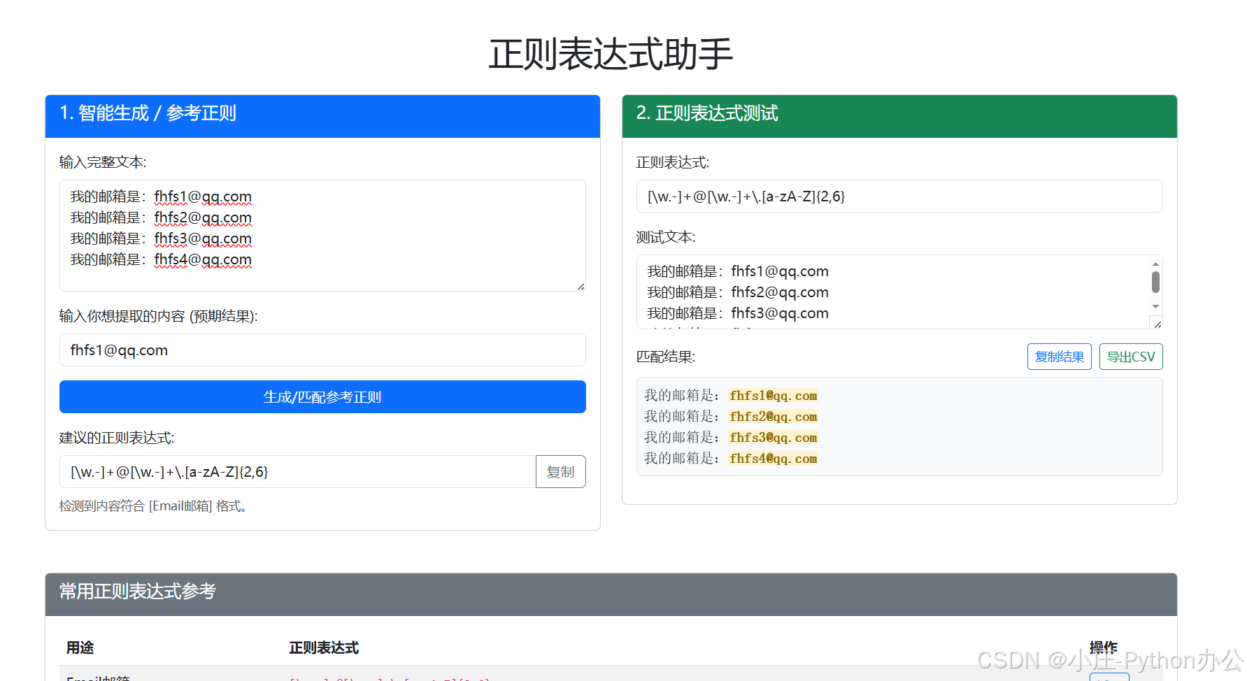为了解决这个问题,我开发了一个纯前端的正则表达式助手,它不仅能帮你测试正则,还能根据你的输入"智能生成"参考正则,并支持将匹配结果一键导出。