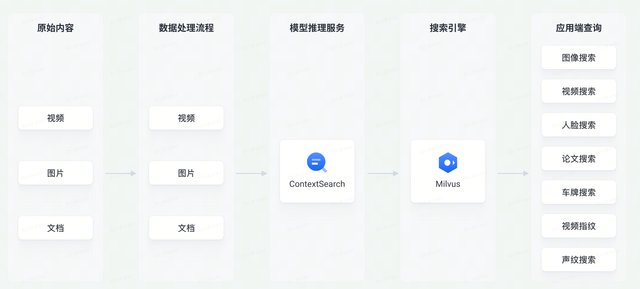 火山引擎 Milvus 与 AI 推理场景结合,通过 Embedding 模型能力处理不同类型的数据,高效索引与精准检索双在线,快速精准地跨媒体类型进行信息检索。