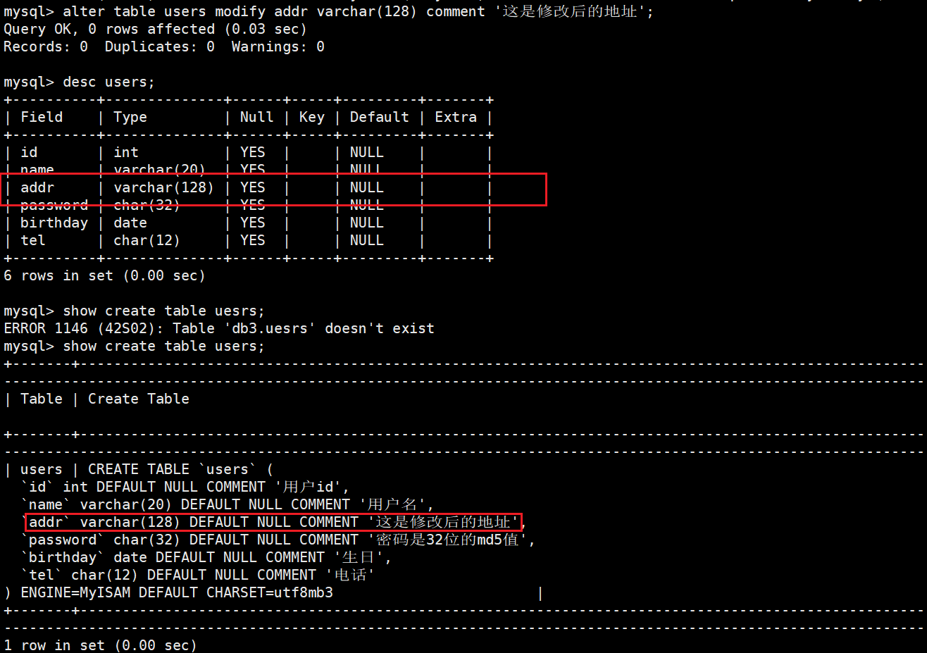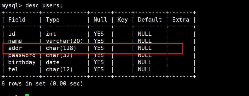 我们将刚才新增的addr修改为varchar(128)。