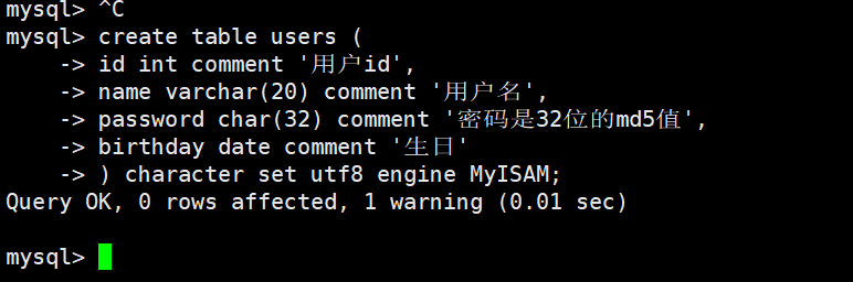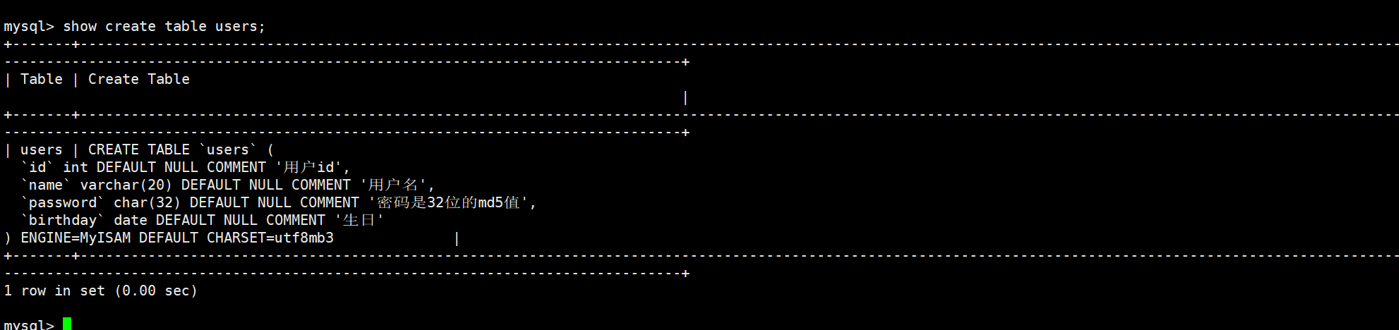 创建一个users表,其用于表示某位人的基本信息:id号、用户名、用户的密码、生日。每个元素后面都带上注释,搜索引擎使用MyISAM,字符集使用utf8。