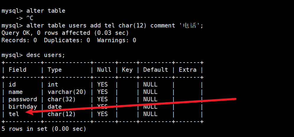 在users表中新增一列用于保存用户的电话。如下: