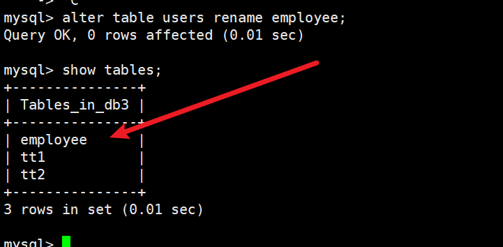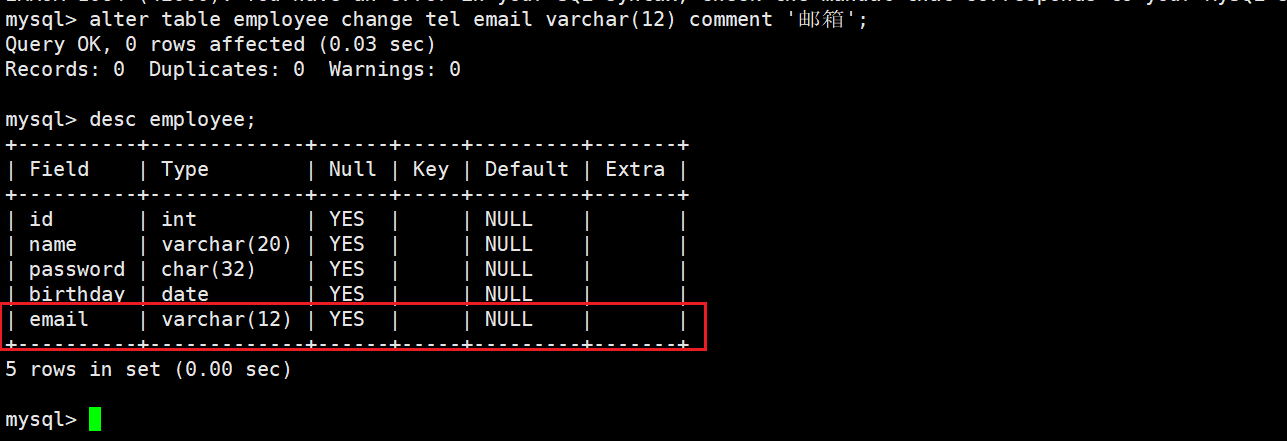 我们刚修改表名后的employee表中的tel修改为email。