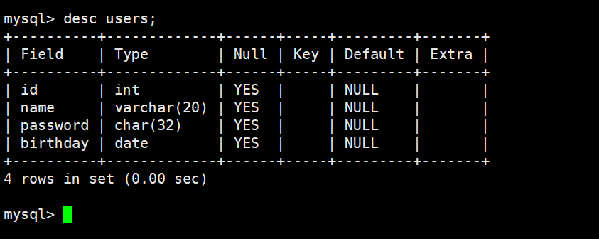 - Null表示该字段是否允许为空。