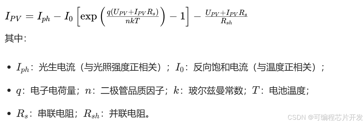 光伏阵列将太阳能转为直流电能,输出电压 / 电流随光照、温度变化;