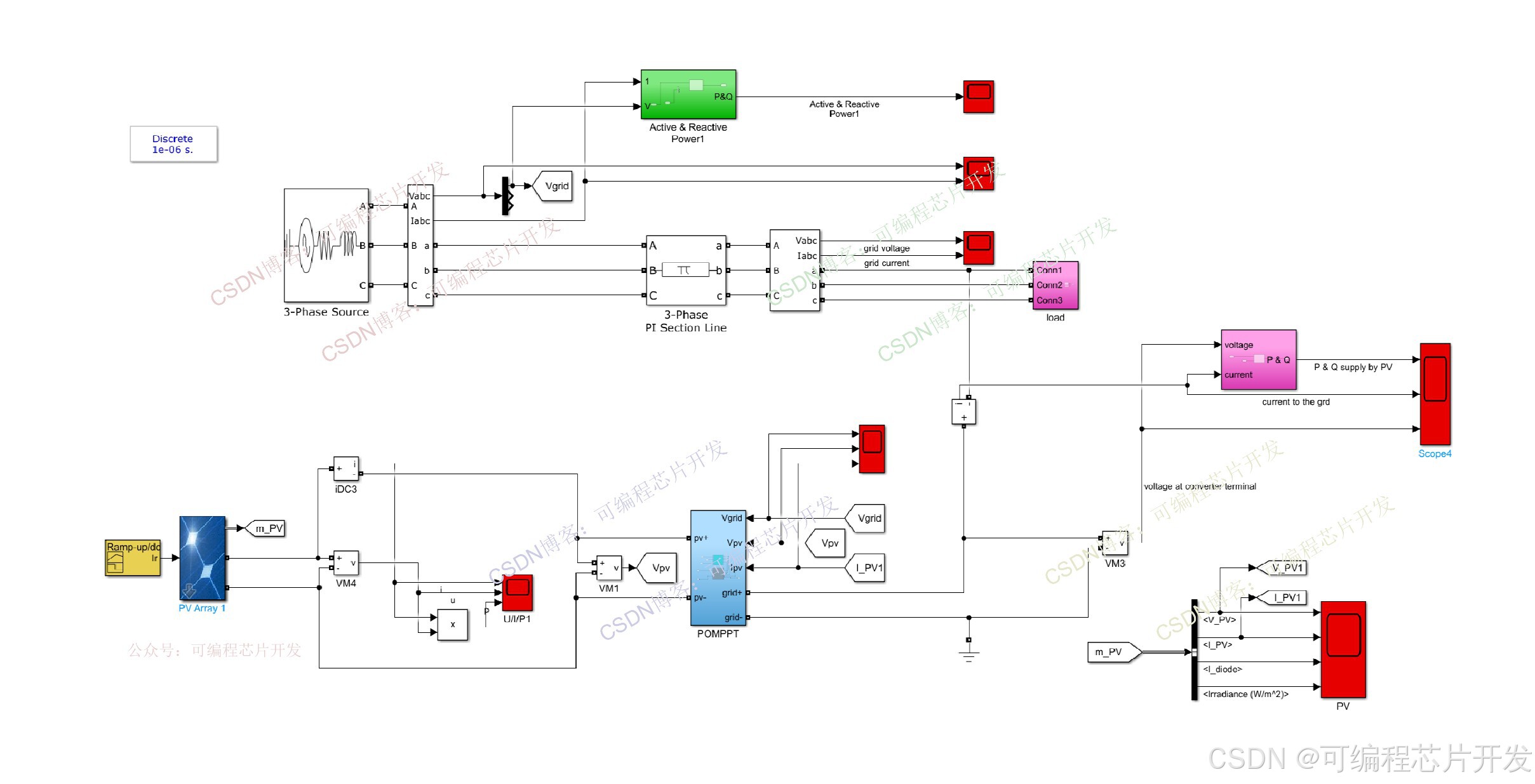 这个基于扰动观察法(P&O)MPPT控制器+IGBT单相全桥逆变器的光伏并网发电系统,是小型分布式光伏并网的典型架构,核心实现 "光伏最大功率提取→直流电能变换→交流并网" 的完整能量转换。