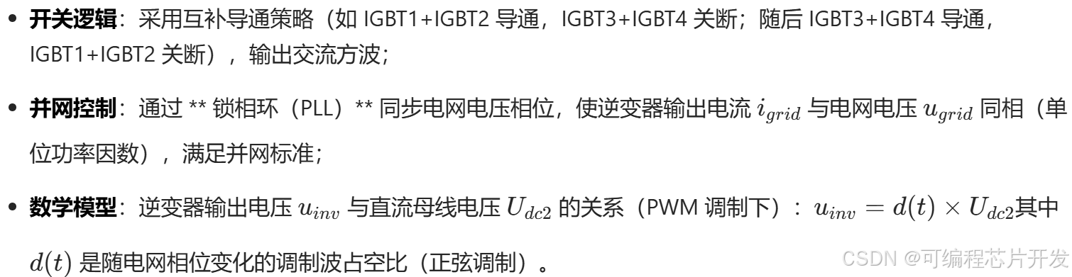 全桥逆变器通过PWM控制IGBT开关,将直流逆变为与电网同频同相的交流,经滤波后并入电网。