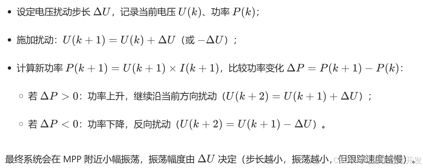 P&O是最常用的MPPT算法,通过 "扰动电压→观察功率变化→调整电压方向" 实现 MPP 跟踪,数学逻辑如下: