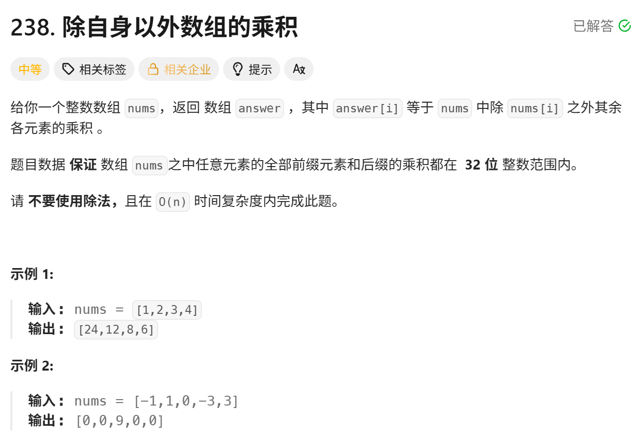 我们可以使用前缀积和后缀积的方法来解决这个问题,避免使用除法: