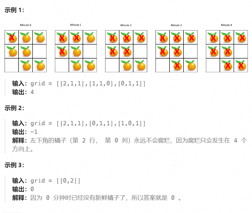 返回 直到单元格中没有新鲜橘子为止所必须经过的最小分钟数。如果不可能,返回 -1 。