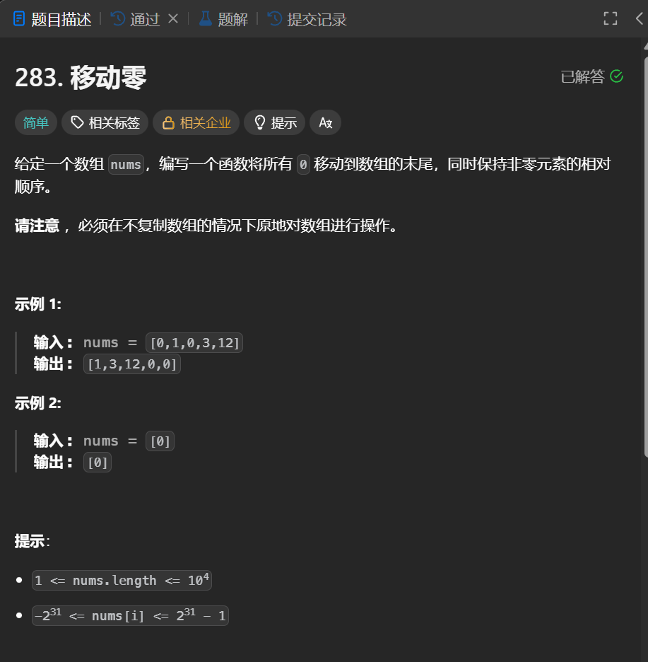 时间复杂度:O(n),只遍历了一次数组,再加一次填 0。