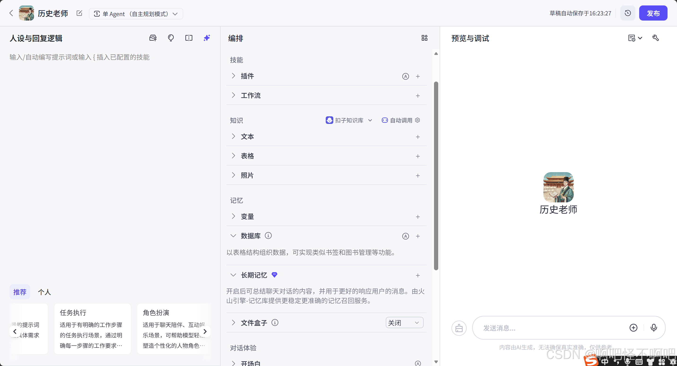 在这边我们可以对智能体的技能,知识,记忆和对话体验来进行修改,从而达到我们的要求。