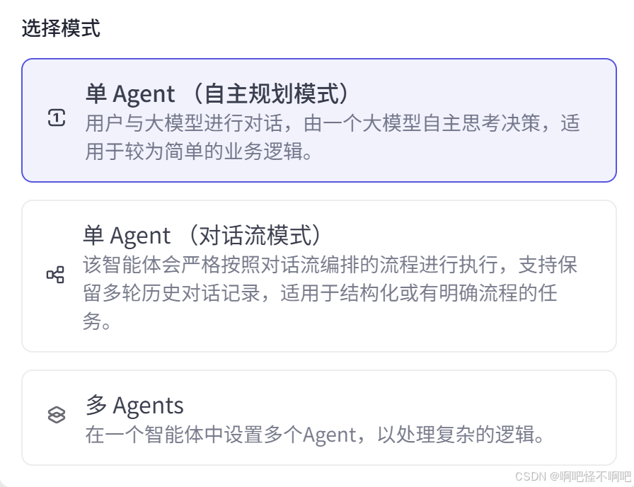 我们看下面这张图,在智能体的开发过程中我们需要选择agent的模式。