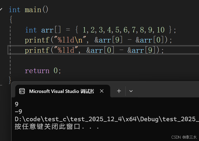 结论:|指针-指针|绝对值,得出的结果是两个指针之间的元素个数