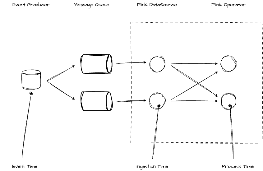从上图中可以看出,在时间产生/存储时,记录一个设备时间,就是 Event Time。当 Flink 的 DataSource 读取到事件时,这时再记录一个时间,这就是 Ingestion Time。在 Flink 程序中,每个算子处理事件时,又会记录一个时间,这个时间就是 Process Time。