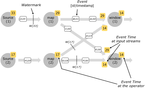 最后,再补充一个与 watermark 相关的比较重要的特性。在 Flink 中,会有一些算子有多个输入源。这时,这个算子的 watermark 是以它收到的数据源中最小的 eventTime 来计算的。直接看官网的例子: