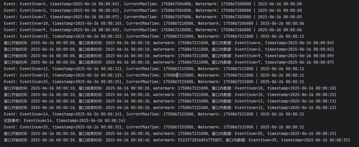 通过输出的日志,我们可以看出,当watermark推进到大于等于时间窗口的结束时间时,窗口就会完成计算并关闭。而对于迟到的数据,我们可以通过侧输出流单独处理,也可以通过设置allowedLateness,使窗口重新打开。