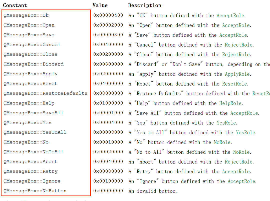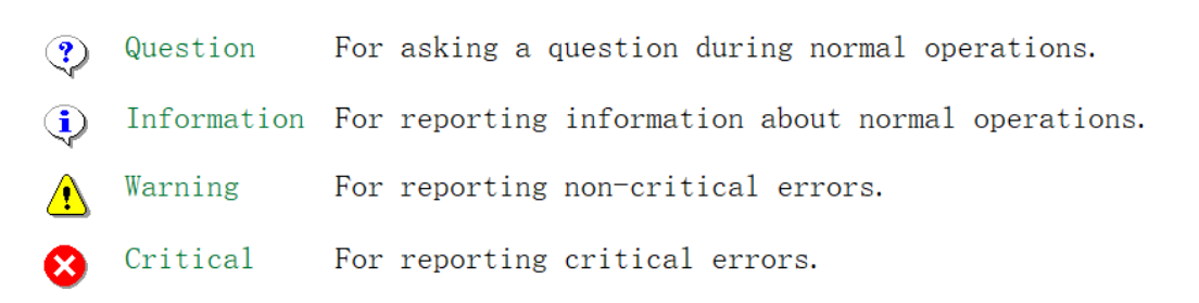 QMessageBox类 中定义了静态成员函数,可以直接调用创建不同风格的消息对话框,其中包括: