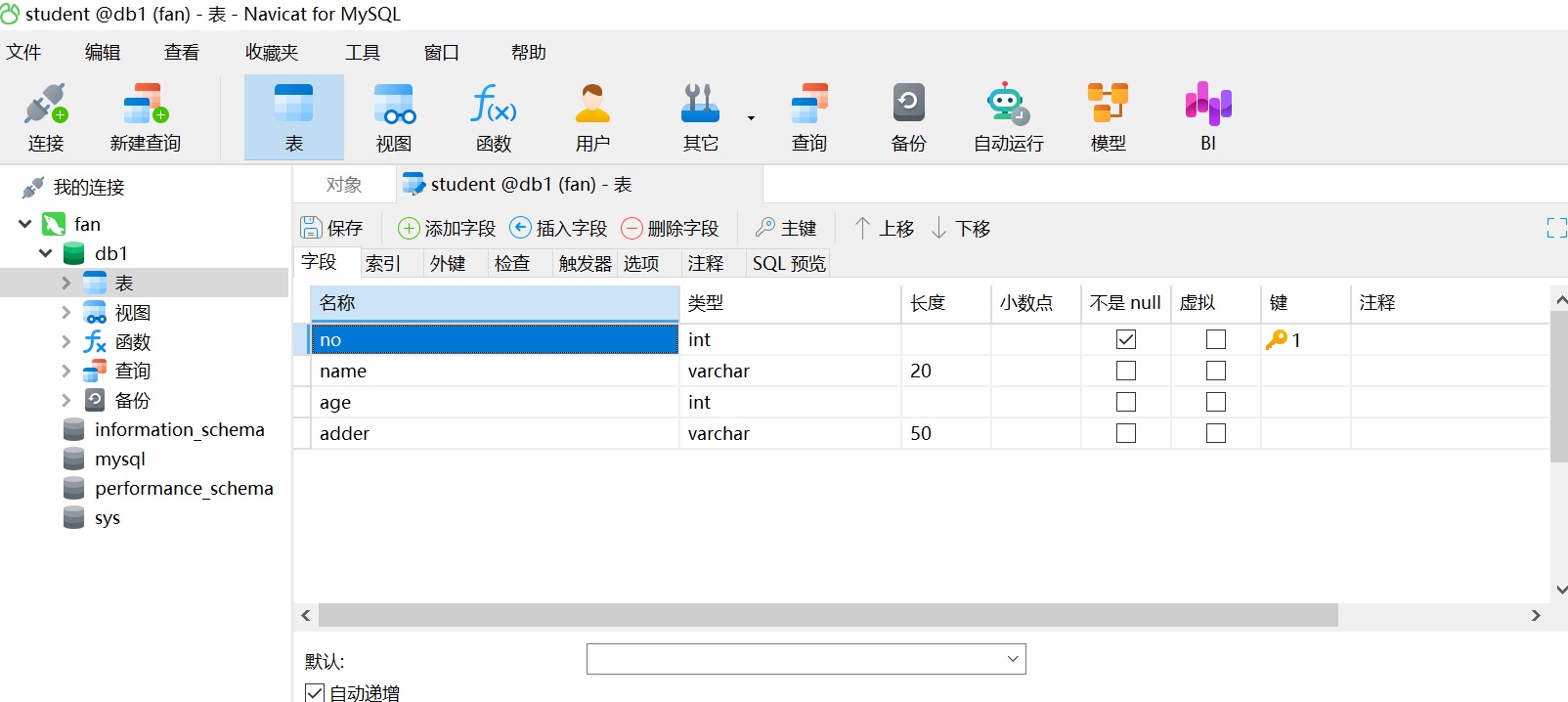 一、首先在Navicat 17 for MySQL中建立数据库db1,然后建立表student