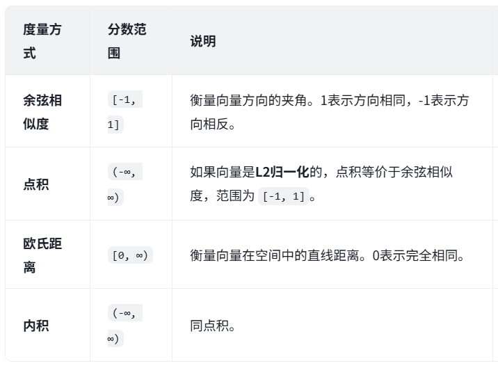 文本内容加强embedding(向量化)存储值由数据库创建向量索引策略方式确定,目前LangChain VectorStores支持向量索引策略计算方法有三种,策略如下: