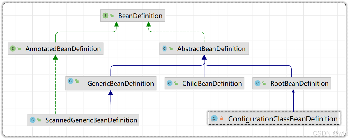 用于描述Bean,包括Bean的名称,Bean的属性,Bean的行为,实现的接口,添加的注解等等,Spring中,Bean在创建之前,都需要封装成对应的BeanDefinition,然后根据BeanDefinition进一步创建Bean对象。