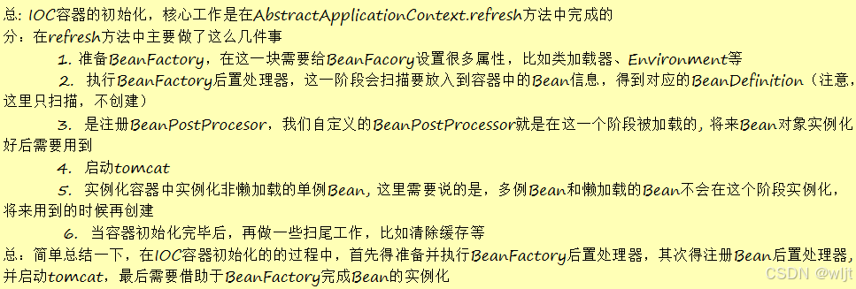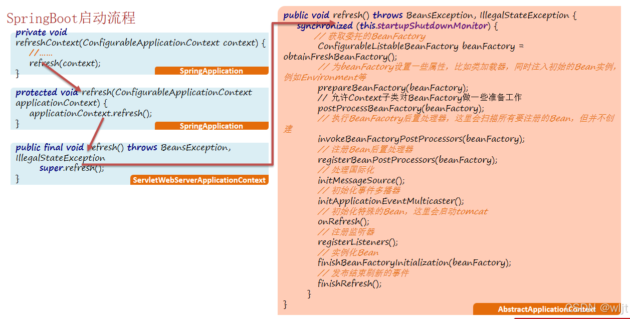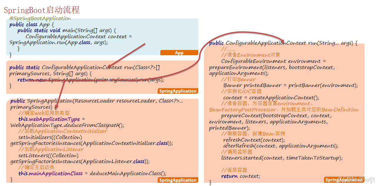 总:总结一下我刚说的,其实SpringBoot启动的时候核心就两步,创建SpringApplication对象以及run方法的调用,在run方法中会真正的实例化容器,并创建容器中需要的Bean实例,最终返回