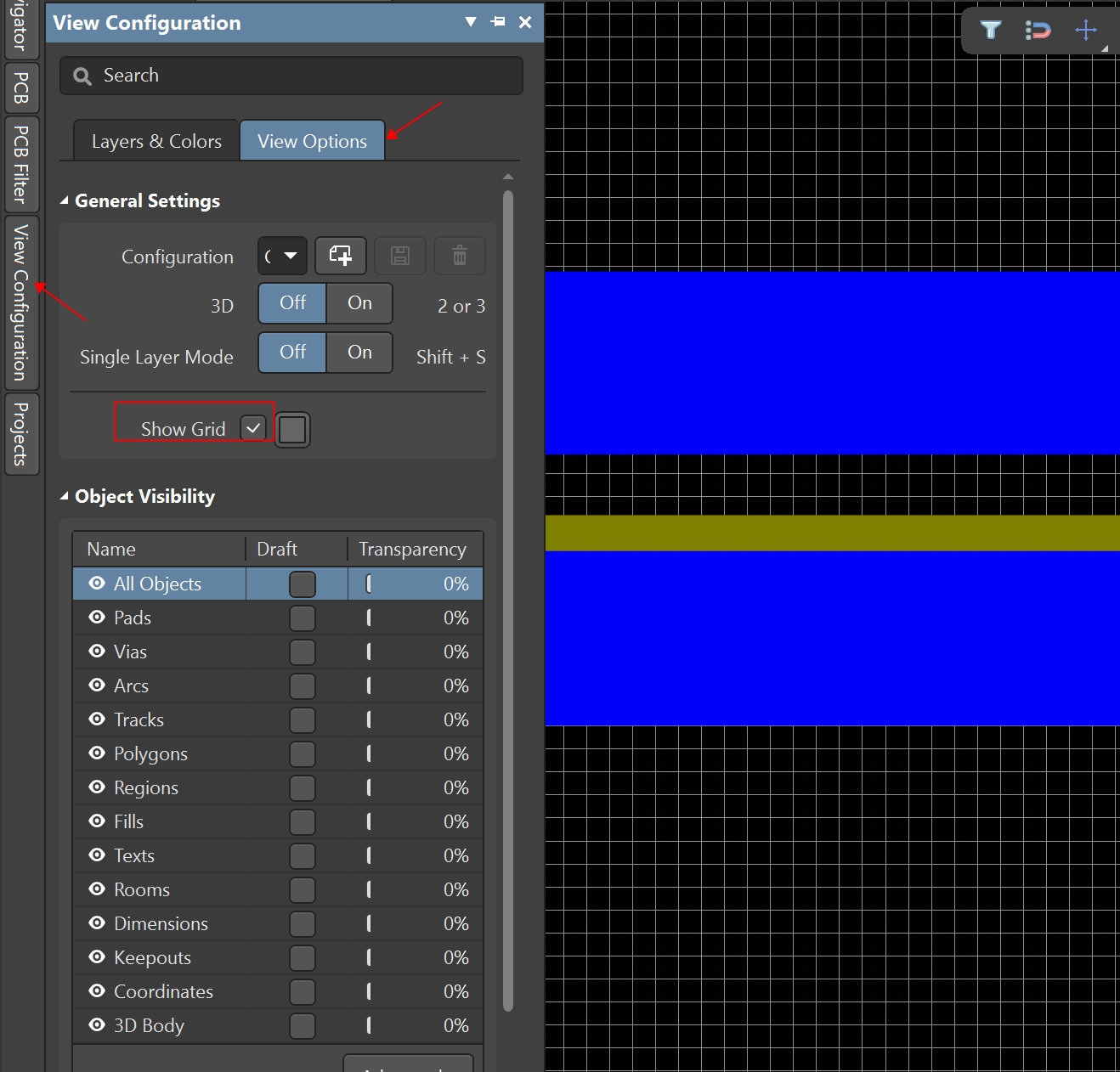 PCB设计中,可以对栅格进行设置大小,用以辅助布局布线。有时候因为误操作会把栅格隐藏,或者拿到别人做的PCB文件进行修改,原设计人员将栅格隐藏了,又不知道怎么设置才能显示栅格;