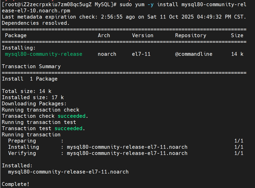 正式安装 MySQL 服务:sudo yum -y install mysql-community-server