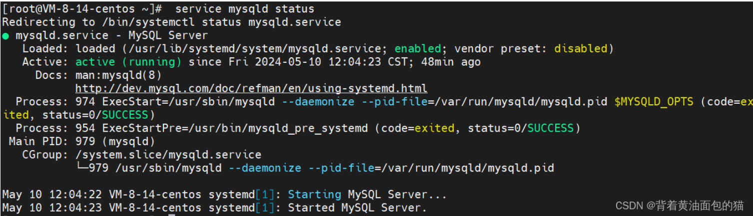 查看服务状态(看是否在运行):sudo systemctl status mysqld.service(运行中会显示 "active (running)")