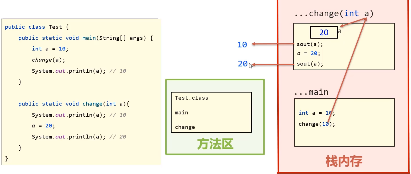 先把类及其中定义的方法加载到方法区,main方法先执行,首先进入栈内存,先定义变量a等于10,将a其中的值拷贝到方法的形参中;之后执行change(),change()加载到栈内存中,此时change接收到的值为10,在该方法中打印a的值为10,将方法中的a赋值为20,再次打印a的值为20;此时change()执行完毕在栈内存中清理,继续执行main(),打印main()中a的值为10,main()执行完毕在栈内存中清理。