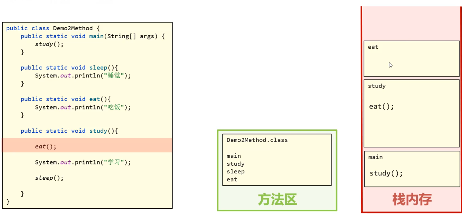 方法在栈内存中执行,先进后出,保证一个方法调用完另一个方法后可以回来。