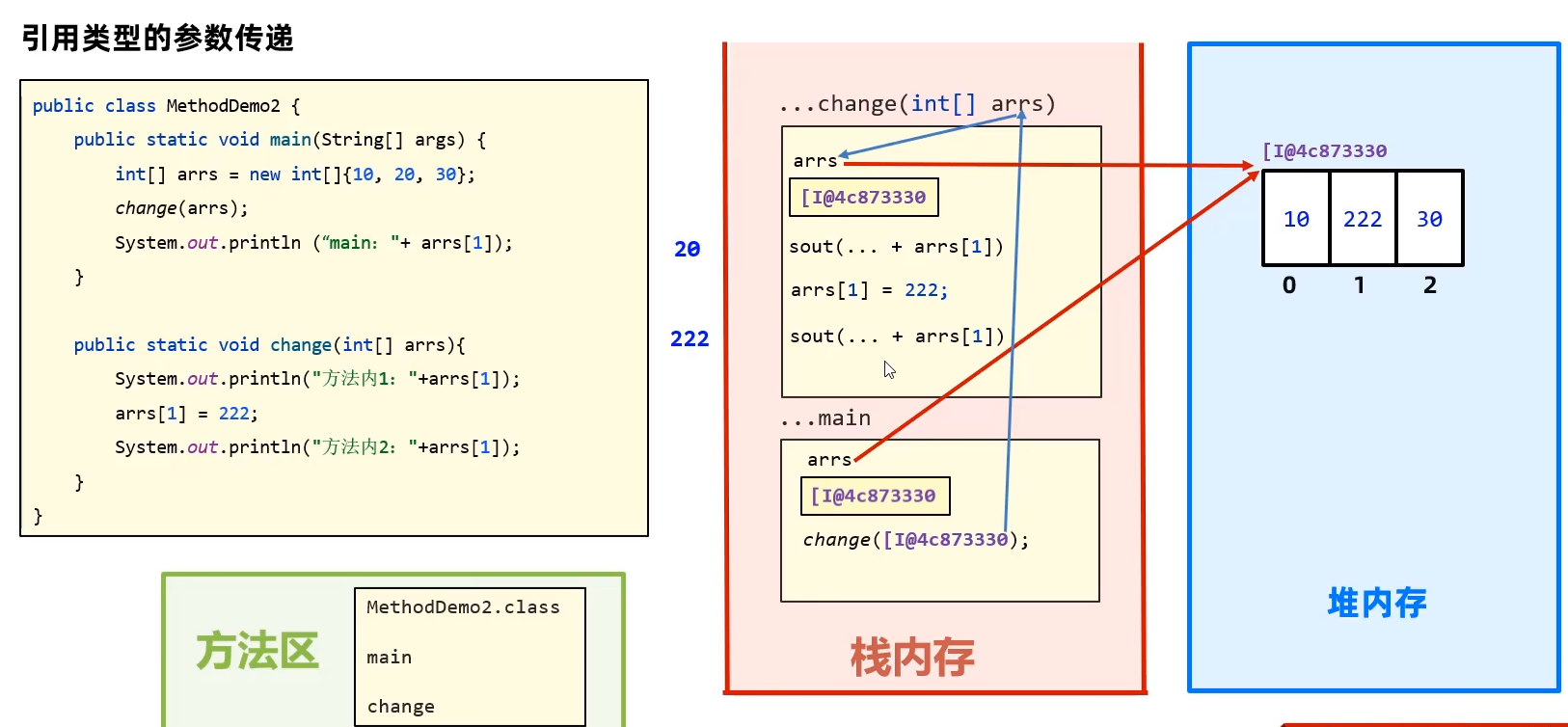 先把类及其中定义的方法加载到方法区,main方法先执行,首先进入栈内存,先定义变量arrs等于{10,20,30},即在堆内存中开辟空间,将堆内存中的地址传给栈内存中的arrs,再将arrs其中的值,即地址拷贝到方法的形参中;之后执行change(),change()加载到栈内存中,此时change接收到的值为数组地址,在该方法中打印arrs[1]的值为20,将arrs[1]指向的数组元素赋值为222,再次打印arrs[1]的值为222;此时change()执行完毕在栈内存中清理,继续执行main(),打印main()中arrs[1]指向的数组算,由于其已经被改变为222,因此打印结果也为222,main()执行完毕在栈内存中清理。
