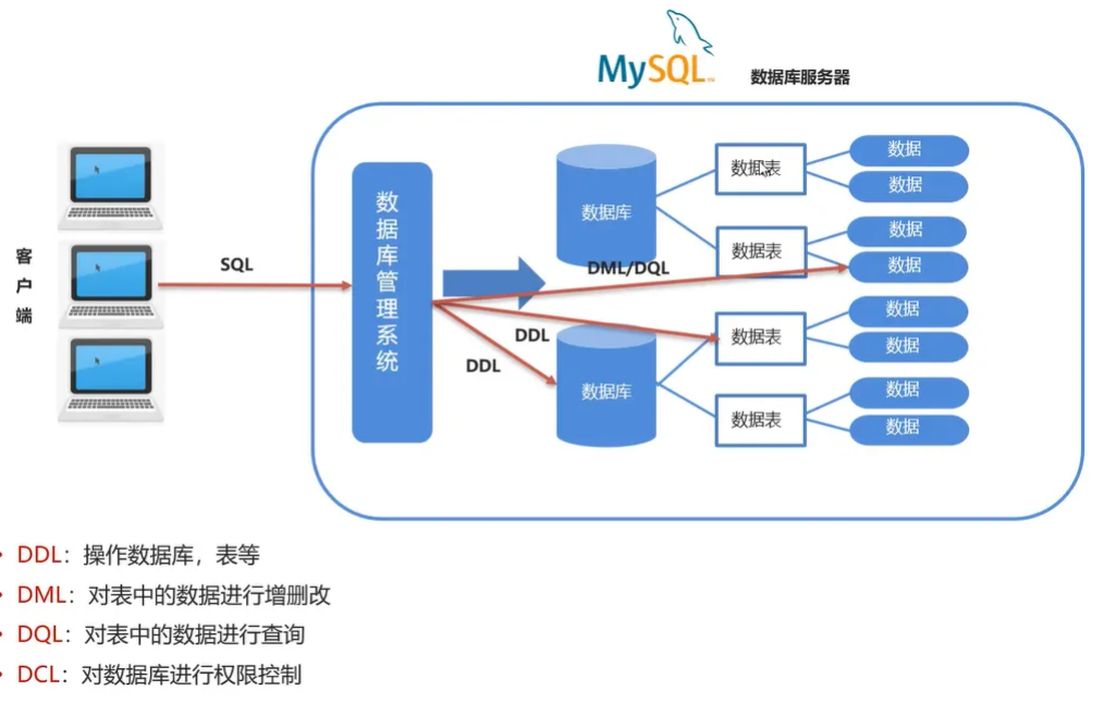 - DCL (Data Control Language)数据控制语言,用来定义数据库的访问权限和安全级别,及创建用户