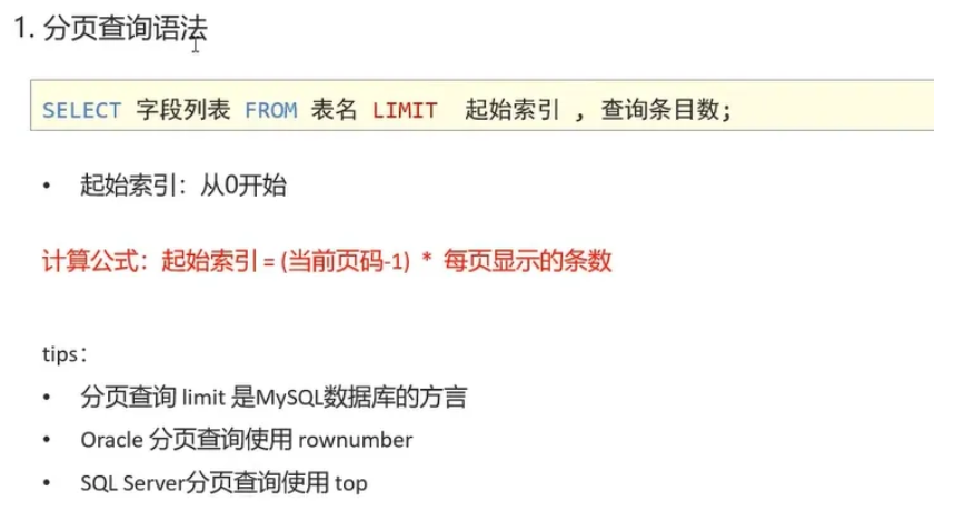 -- 起始索引 = (当前页码 - 1) * 每页显示的条数