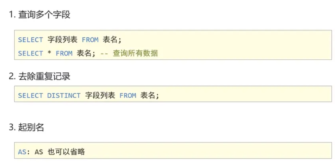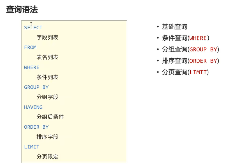 - DQL(Data Query Language)数据查询语言,用来查询数据库中表的记录(数据)