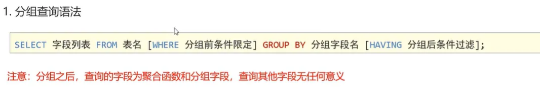 -- 注意:分组之后,查询的字段为聚合函数和分组字段,查询其他字段无任何意义